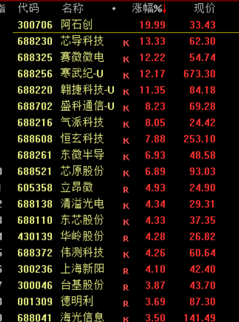 其中寒武紀漲幅超12%,賽微微電、芯導科技漲幅超10%,恒玄科技漲幅近8%,氣派科技、東微半導也隨之上漲。