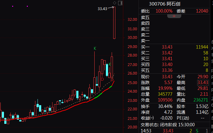 午后,芯片股持續(xù)拉升,阿石創(chuàng)20cm漲停,芯導科技漲超13%,寒武紀漲超12%,賽微微電、翱捷科技漲超11%,恒玄科技、氣派科技、立昂微、臺基股份、華虹公司等跟漲。