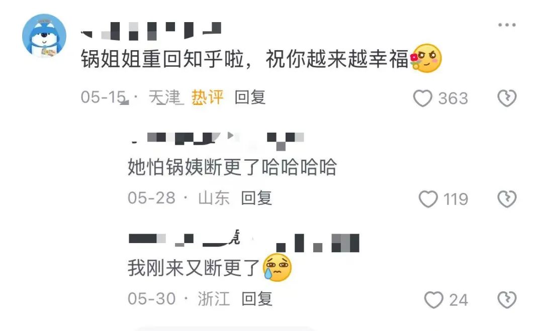 在最近的更新中,平底鍋回答了知乎上“大齡剩女,會為了擇偶降低要求么”的問題。鍋老師稱自己渴望“一生一世一雙人”,最終還是嫁給了二婚男人,“但并不后悔”。網(wǎng)友們雖然嘴上吐槽“這不算新內(nèi)容”“怎么沒有圓房情節(jié)”,但還是熱烈歡迎平底鍋回歸,還擔(dān)心她再次受到批評,紛紛親切地稱呼她為“鍋姐姐”。