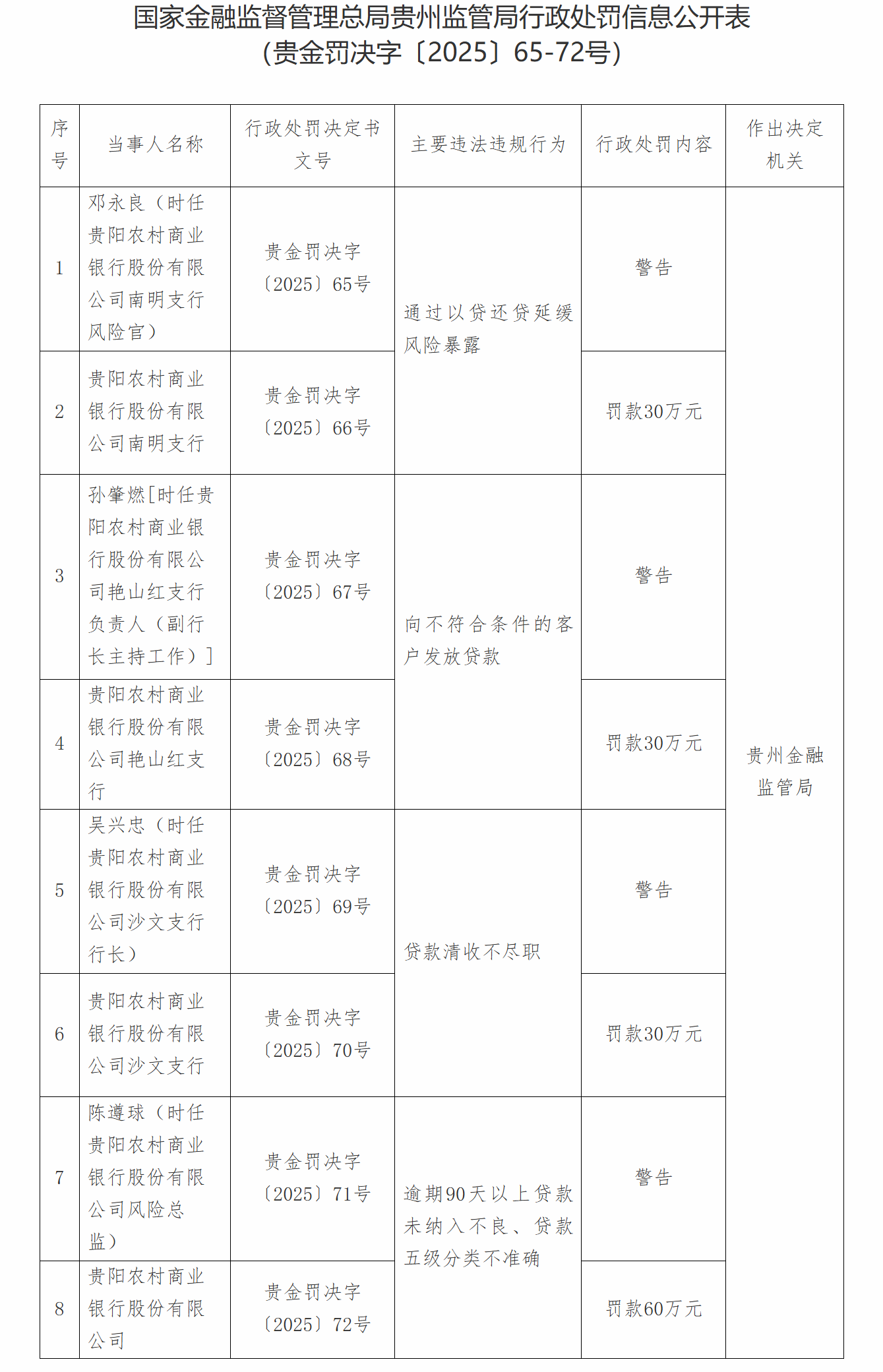 貴陽(yáng)農(nóng)商行南明支行通過(guò)以貸還貸延緩風(fēng)險(xiǎn)暴露,被罰款30萬(wàn)元。時(shí)任貴陽(yáng)農(nóng)商行南明支行風(fēng)險(xiǎn)官鄧永良對(duì)此違規(guī)行為擔(dān)責(zé),被警告。
