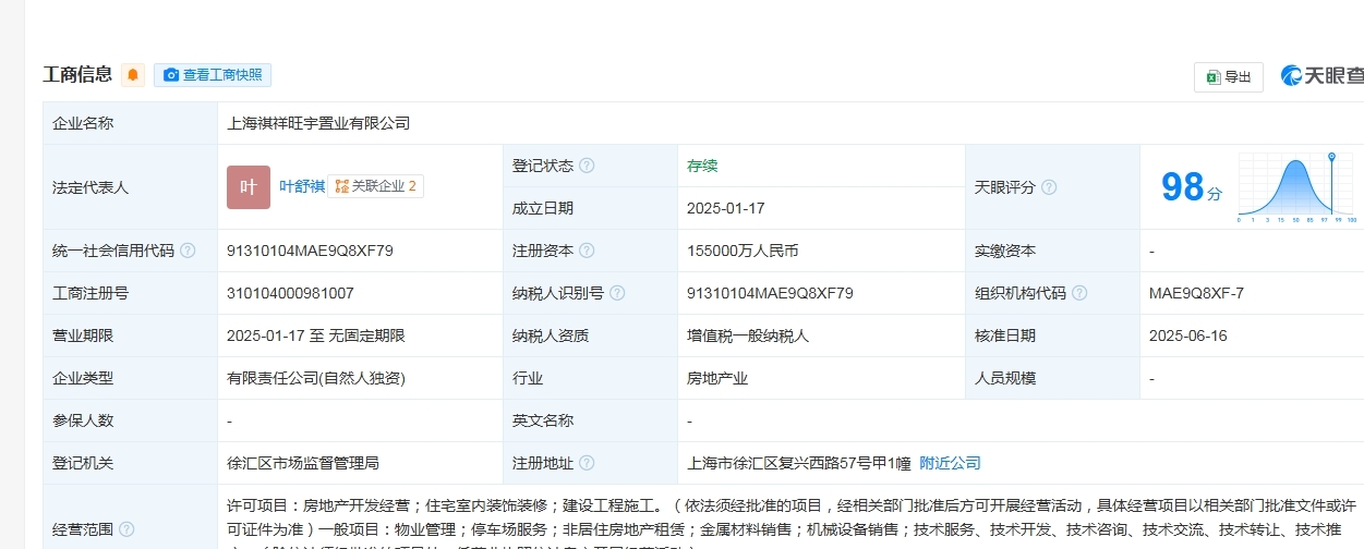 上海祺祥旺宇置業(yè)有限公司于2025年1月注冊,公司地址位于上海市徐匯區(qū)復(fù)興西路57號甲1幢,股東為自然人葉舒祺。