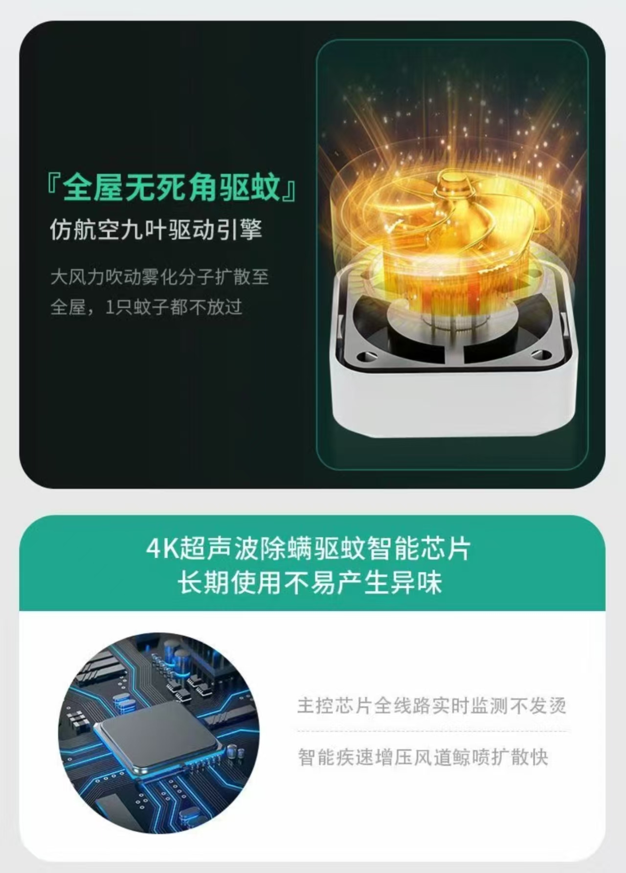 小雷還發(fā)現,不只是桌面電風扇,其他靠“米家生態(tài)”打擦邊球的山寨小家電也不少。比如一款宣稱接入米家生態(tài)的智能驅蚊器,在產品標簽里刻意模糊自己品牌,強調“米家智能”,還有“三核芯片”“4K超聲波驅蚊智能芯片”等,明顯是針對小白的山寨營銷。
