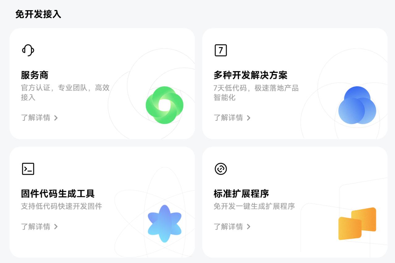 根據小米澎湃智聯IoT開發(fā)者平臺官網,米家有完整的免開發(fā)接入流程,支持低代碼快速開發(fā)固件,對于燈、開關、電機等成熟品類,還有專門的免開發(fā)解決方案,技術力量弱的小作坊也能在7天內0代碼快速接入,接入成本不高。