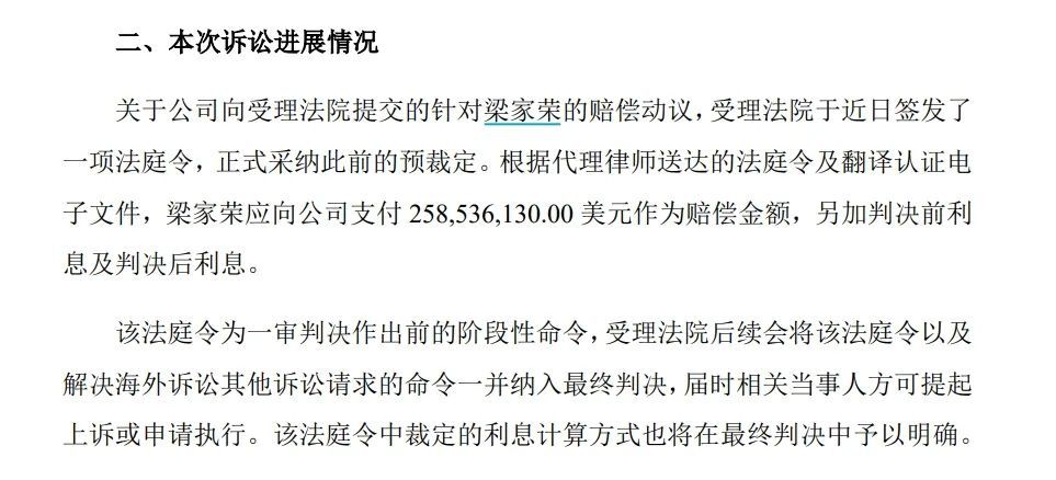 受理法院在2025年6月的聽證會上批準(zhǔn)了一項(xiàng)預(yù)裁定,內(nèi)容為:梁家榮需向公司支付2.585億美元作為賠償,另加判決前利息及判決后利息。不過,該預(yù)裁定目前不具執(zhí)行力,需等受理法院后續(xù)簽發(fā)正式法庭令并轉(zhuǎn)化為法院判決后才生效。