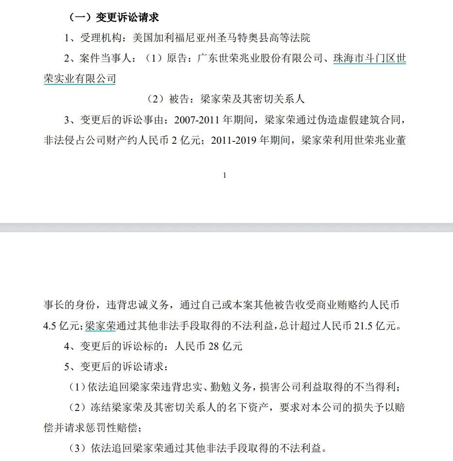 2022年12月24日,世榮兆業(yè)披露重大訴訟進(jìn)展公告,將訴訟標(biāo)的變更為人民幣28億元。變更后的訴訟事由顯示,2007 - 2011年期間,梁家榮通過偽造虛假建筑合同,非法侵占公司財產(chǎn)約2億元;2011 - 2019年期間,他利用董事長身份,違背忠誠義務(wù),通過自己或其他被告收受商業(yè)賄賂約4.5億元;通過其他非法手段取得的不法利益總計超21.5億元。