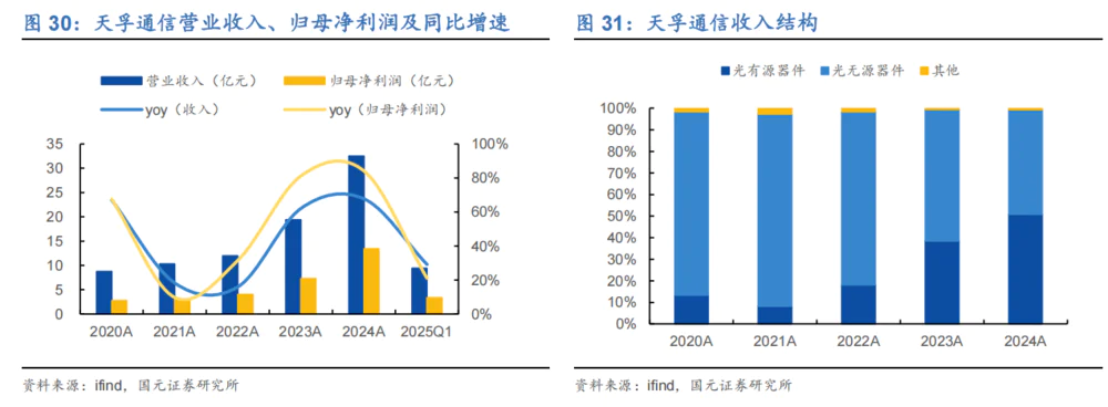 天孚通信營業(yè)收入及歸母凈利潤保持了相對穩(wěn)定的高速增長。2020 - 2024年,營業(yè)收入由8.73億元增長至32.52億元,年復(fù)合增長率達(dá)38.91%。2020 - 2024年,歸母凈利潤由2.79億元增長至13.44億元,年復(fù)合增長率達(dá)48.12%。天孚通信收入結(jié)構(gòu)中光有源器件和光無源器件占主導(dǎo)。2024年光有源器件收入占比50.91%;光無源器件收入占比48.48%;其他收入占比0.62%。