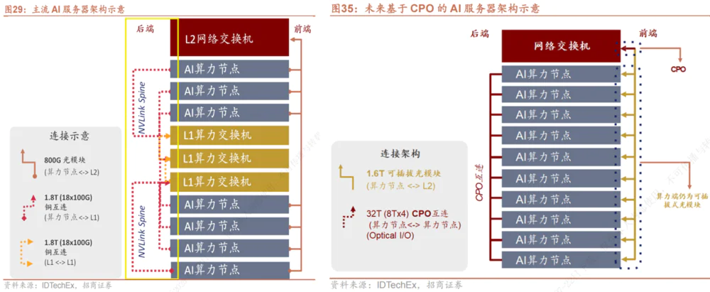 光模塊是CPO的“前身”,CPO通過硅光技術(shù)(在硅基芯片上集成光學(xué)器件)實(shí)現(xiàn)光引擎微型化,然后與芯片封裝融合。在短距高速場景,如機(jī)柜內(nèi),CPO憑借低功耗、高密度成為首選;而在中長距場景,如跨機(jī)房,傳統(tǒng)光模塊仍占主導(dǎo)地位,因?yàn)镃PO信號(hào)衰減大。一臺(tái)AI服務(wù)器可能同時(shí)使用CPO(GPU間互聯(lián))和傳統(tǒng)光模塊(機(jī)柜間連接)。