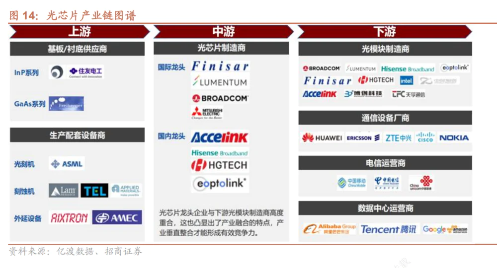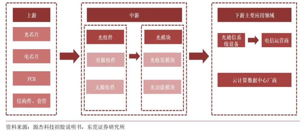 光通信行業(yè)上游原材料主要由光/電芯片、PCB等構(gòu)成,中游光器件包括光組件(有源組件、無源組件),光組件通過不同封裝方式構(gòu)成光模塊。下游應(yīng)用于光通信系統(tǒng)設(shè)備中,主要面向電信運(yùn)營商、云服務(wù)廠商、數(shù)據(jù)中心廠商等領(lǐng)域。