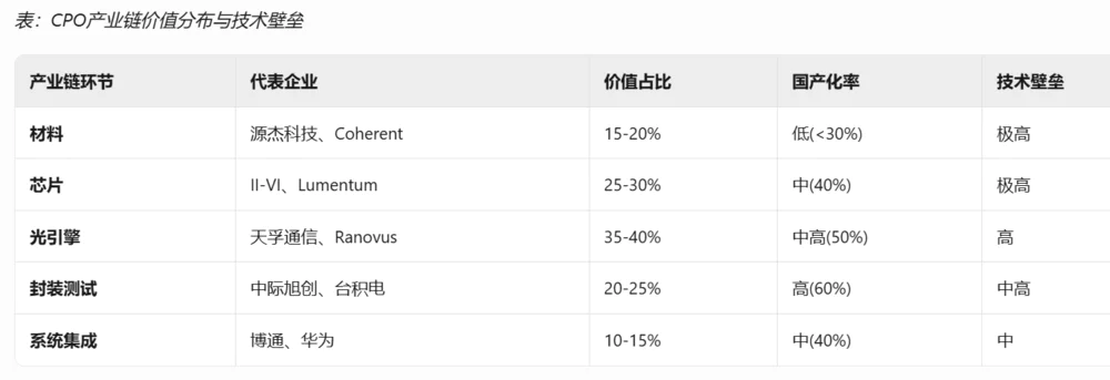 CPO產(chǎn)業(yè)鏈呈現(xiàn)金字塔結(jié)構(gòu),各環(huán)節(jié)技術(shù)壁壘與價(jià)值分布不均。上游材料與設(shè)備中,硅光芯片是決定光轉(zhuǎn)換效率的核心材料,25G以上芯片國產(chǎn)化率不足30%;磷化銦襯底是高端激光器關(guān)鍵材料,被日美企業(yè)壟斷。中游制造與封裝環(huán)節(jié),光引擎集成占據(jù)CPO價(jià)值占比40%,技術(shù)壁壘最高;測試驗(yàn)證環(huán)節(jié)成本占產(chǎn)品總成本25%以上。