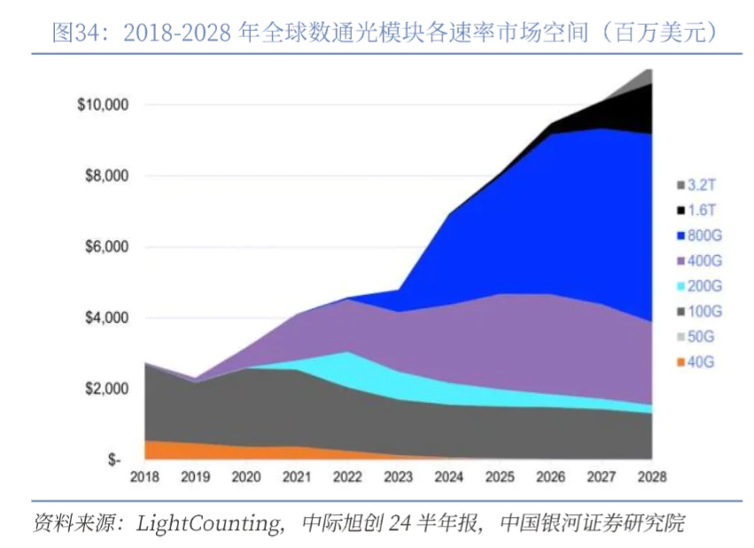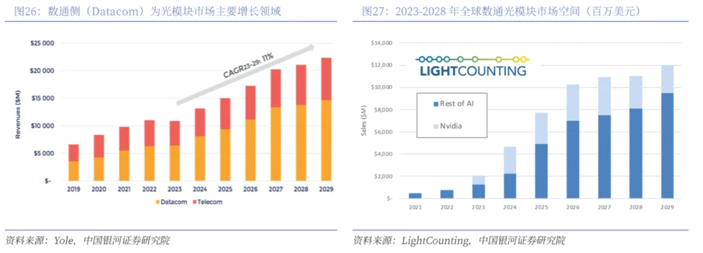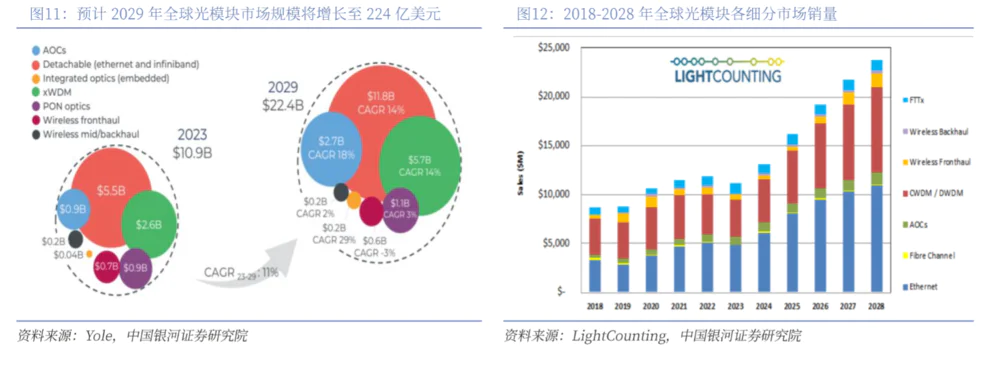 光模塊是全球AI投資中算力網(wǎng)絡(luò)端的重要環(huán)節(jié),AI成為光模塊數(shù)通(數(shù)據(jù)通訊)市場的核心增長力。根據(jù)Yole預(yù)測,全球受AI驅(qū)動(dòng)的光模塊市場預(yù)計(jì)在2024年將達(dá)到同比45%的增長。從細(xì)分領(lǐng)域來看,用于以太網(wǎng)&Infiniband的光模塊、用于數(shù)通短距離互聯(lián)場景的AOC有源光模塊,兩者在2029年市場規(guī)模將分別達(dá)到118億美元和27億美元,2023 - 2029年的年復(fù)合增速將分別達(dá)14%和18%。