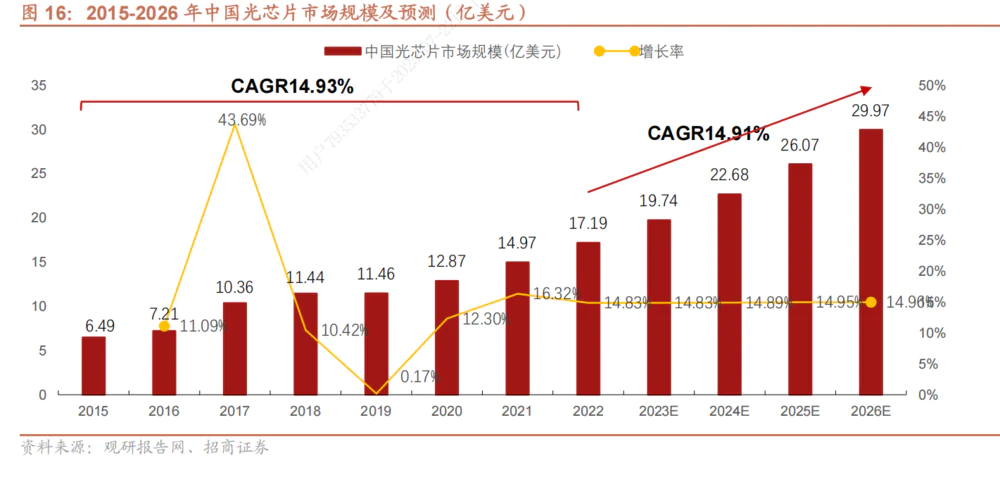 國內(nèi)光芯片市場高速增長,產(chǎn)業(yè)政策重點(diǎn)支持。2015年,我國光芯片市場規(guī)模僅為5.56億美元,此后受益于互聯(lián)網(wǎng)快速發(fā)展帶來的大量新型基礎(chǔ)設(shè)施需求,光通信市場光芯片市場加速發(fā)展,未來幾年大量數(shù)據(jù)中心設(shè)備更新和新數(shù)據(jù)中心落地也會(huì)持續(xù)助力光芯片市場規(guī)模的增長,預(yù)計(jì)至2026年我國光芯片市場有望擴(kuò)大至29.97億美元。