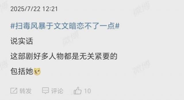 緝毒劇《掃毒風(fēng)暴》開播后,部分觀眾覺得于文文飾演的王奇這個(gè)角色純屬多余,甚至一看到王奇的戲份就跳過。此外,還有觀眾吐槽于文文演技差。