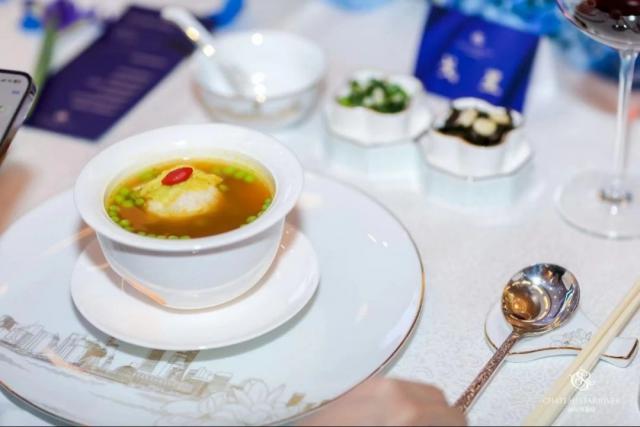 此外,淮揚(yáng)菜多以水產(chǎn)為原料,注重食材的鮮活。而且?guī)缀趺康啦藢υ隙加袊?yán)格的選料要求,能充分發(fā)揮原料的特點(diǎn)。比如,星河灣酒店“品鑒之夜”推出的湯品“金酸湯江鮮獅子頭”就很有創(chuàng)新之處。據(jù)陳昱總廚介紹,這道獅子頭選用優(yōu)質(zhì)白鱸魚為主料,去除紅肉后反復(fù)摔打上勁制成,成品潔白無暇,口感鮮嫩,搭配老肉骨吊制的金酸湯,味道十分鮮美。