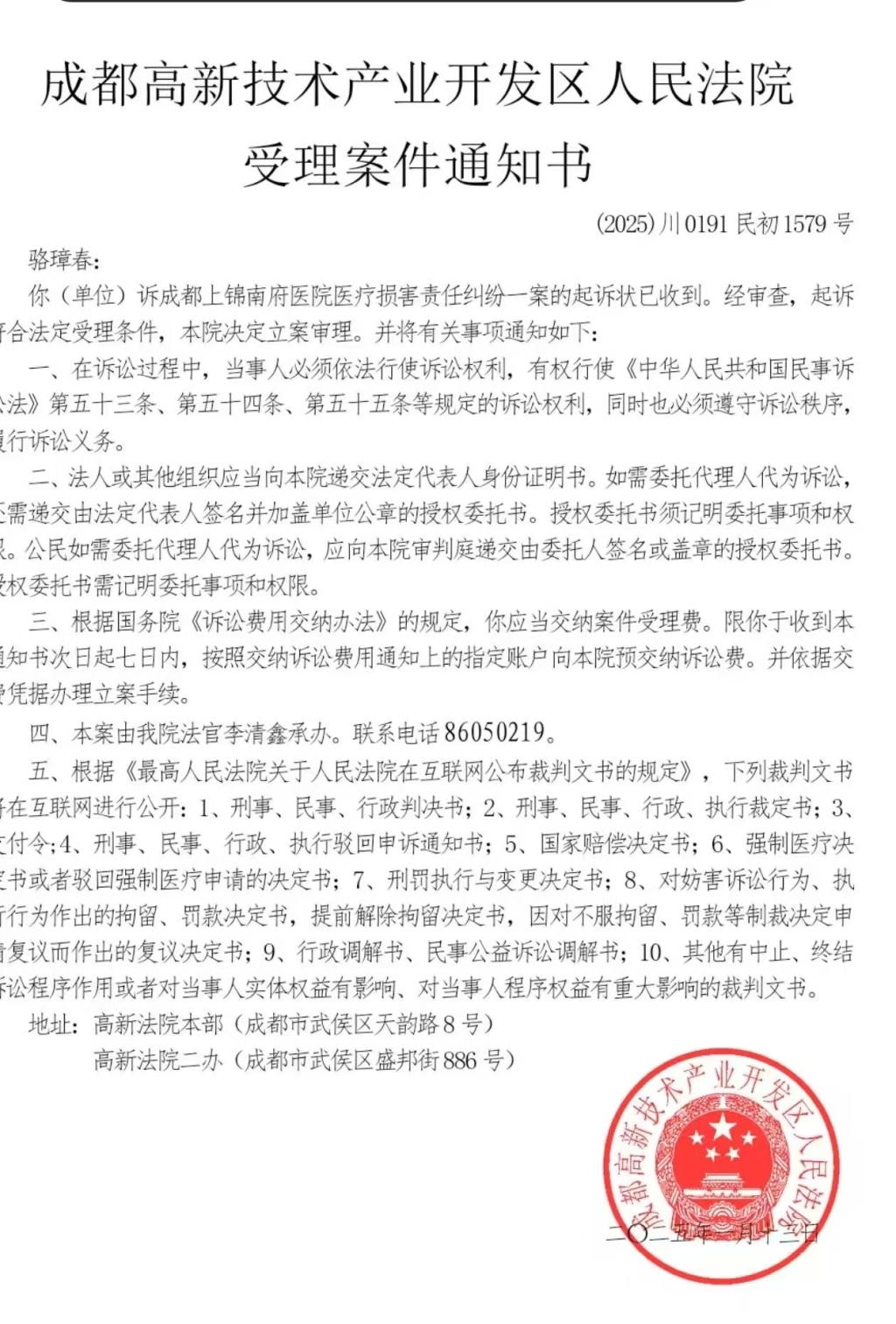 患者駱章春起訴上錦醫(yī)院的受理通知書。