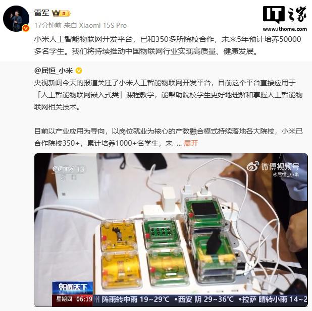 IT之家7月25日消息,雷軍今日轉(zhuǎn)發(fā)央視新聞相關(guān)報(bào)道,并配文表示:“小米人工智能物聯(lián)網(wǎng)開發(fā)平臺,已和350多所院校展開合作,未來5年預(yù)計(jì)培養(yǎng)50000多名學(xué)生?!?/p>