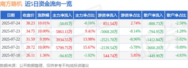 異動快報:南方路機7月25日9點32分觸及漲停板