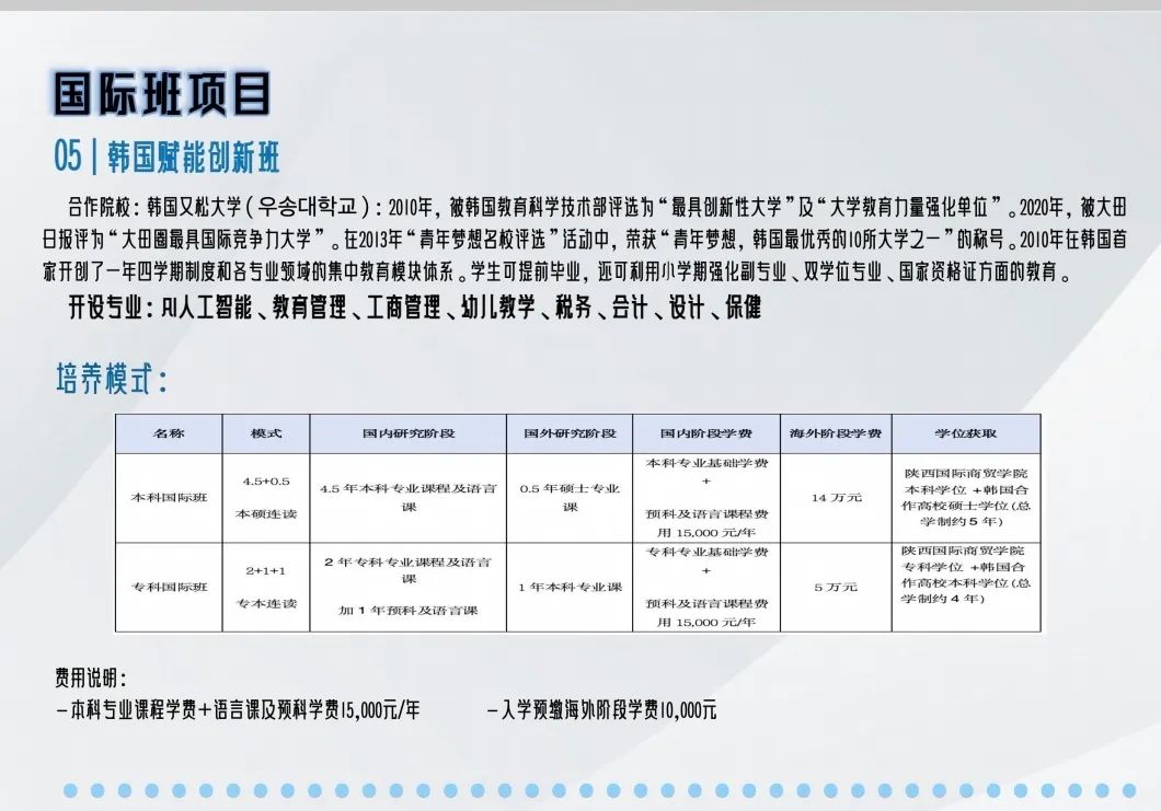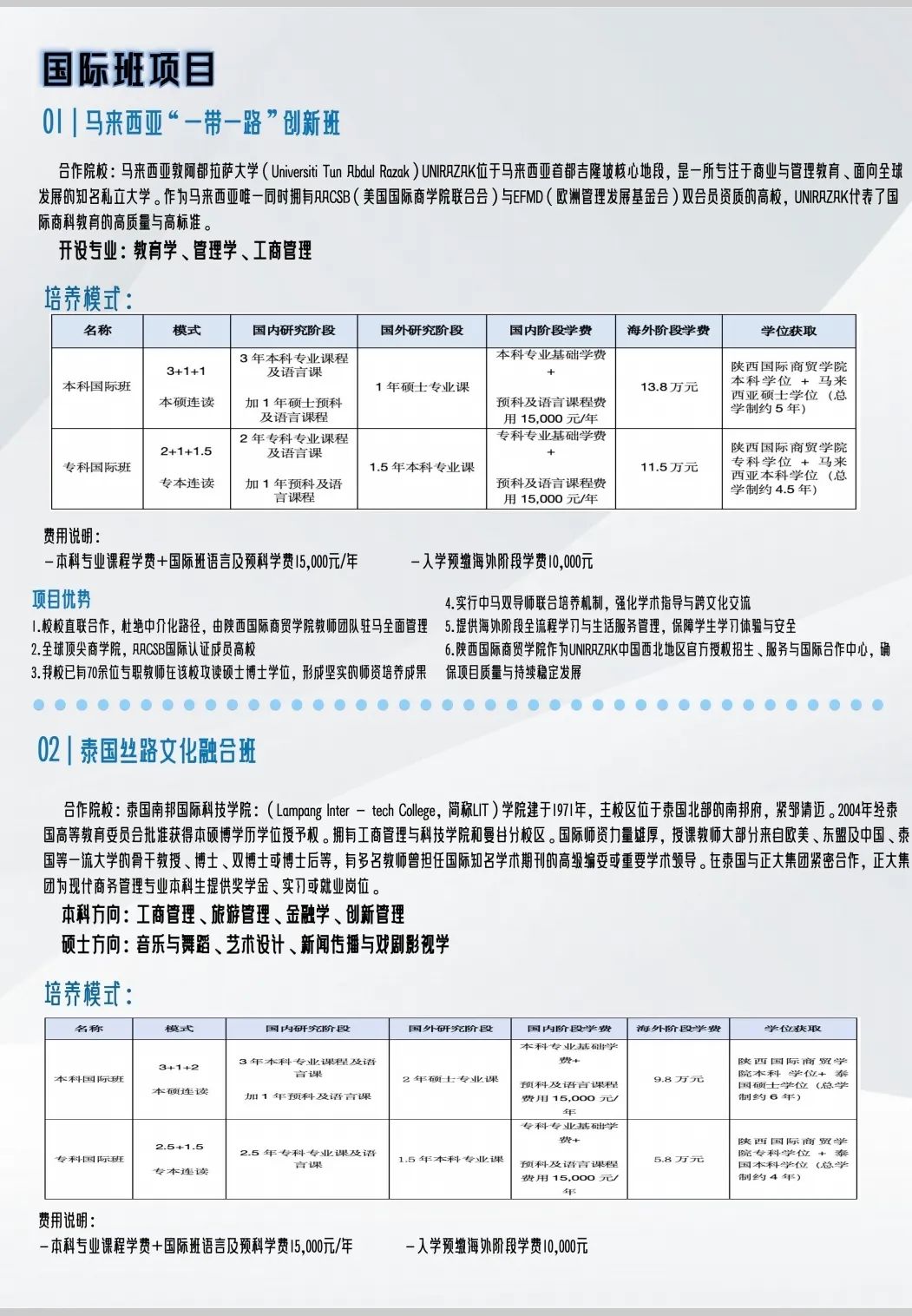 新增馬來西亞“一帶一路”創(chuàng)新班(本科國際班:3+1+1本碩連讀);韓國賦能創(chuàng)新班(本科國際班:4.5+0.5本碩連讀);新加坡菁英班(本科國際班:3+1+1本碩連讀);英國國際菁英班(本科國際班:3+1+1本碩連讀);泰國絲路文化融合班(本科國際班:3+1+2本碩連讀)。培養(yǎng)學(xué)生成長為具有國際視野的應(yīng)用型高級人才。