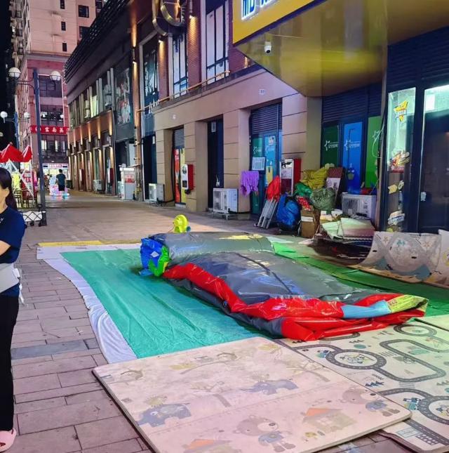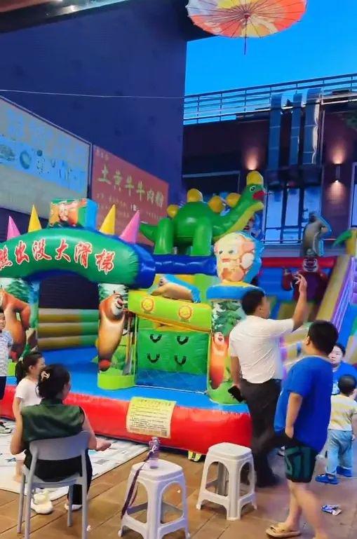 7月15日晚,“融媒 + 督查”工作組在中壩路的云巖大都會(huì)小區(qū)看到,一家便利店門口空地上有個(gè)占地約3平方米的兒童娛樂充氣堡。旁邊另一處空地上,還有個(gè)占地約6平方米、高約一層樓的兒童娛樂充氣堡,不少兒童正在里面玩耍。