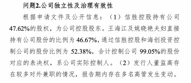 根據(jù)申請(qǐng)文件及公開信息,信勝控股持有公司47.62%的股權(quán),為公司控股股東。王海江及姚曉艷夫婦直接持有公司股份的比例為46.67%,通過信勝控股和海創(chuàng)投資控制公司的股份比例為52.38%,合計(jì)控制公司99.05%的股份對(duì)應(yīng)的表決權(quán),系公司實(shí)際控制人。發(fā)行人董監(jiān)高存在較多對(duì)外兼職的情況,報(bào)告期內(nèi)存在多名高管發(fā)生變動(dòng)。