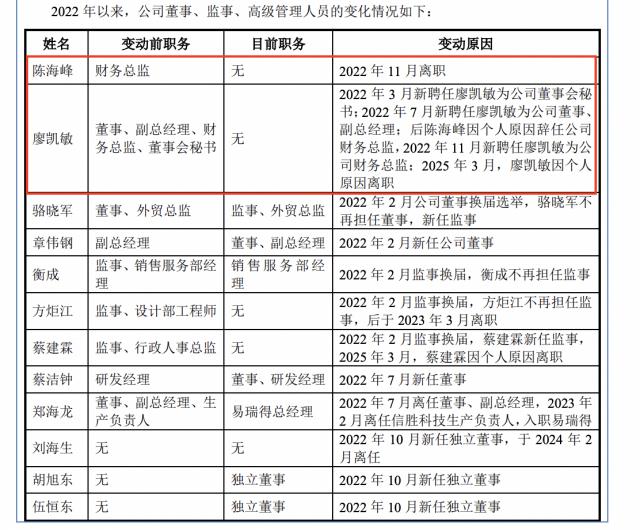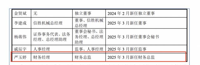 招股書顯示,2022年3月,信勝科技新聘任廖凱敏為公司董事會(huì)秘書;2022年7月新聘任廖凱敏為公司董事、副總經(jīng)理;后陳海峰因個(gè)人原因辭任公司財(cái)務(wù)總監(jiān),2022年11月新聘任廖凱敏為公司財(cái)務(wù)總監(jiān);2025年3月,廖凱敏因個(gè)人原因離職;2025年3月,新聘任嚴(yán)玉婷為公司財(cái)務(wù)總監(jiān)。