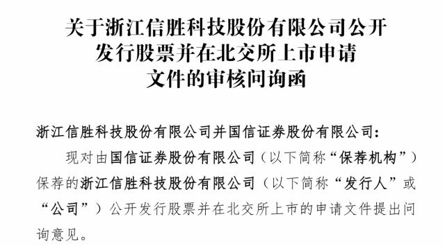 瑞財(cái)經(jīng) 劉治穎 7月23日,浙江信勝科技股份有限公司(以下簡(jiǎn)稱:信勝科技)披露北交所上市審核問詢函,保薦機(jī)構(gòu)為國信證券股份有限公司,保薦代表人為陳航飛、劉飛翔,會(huì)計(jì)師事務(wù)所為立信會(huì)計(jì)師事務(wù)所。