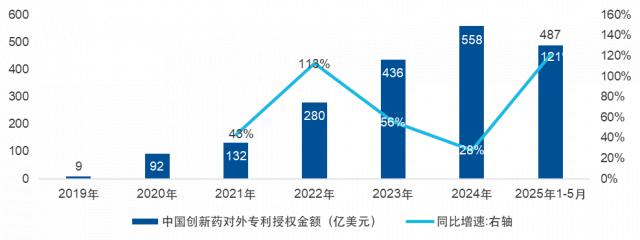 近年來(lái),中國(guó)在全球創(chuàng)新藥產(chǎn)業(yè)中的地位逐步提升,定位向高價(jià)值量的研發(fā)設(shè)計(jì)領(lǐng)域升級(jí)。2025年1 - 5月,海外藥企從中國(guó)采購(gòu)創(chuàng)新藥專利金額達(dá)487億美元,同比增長(zhǎng)121%,接近2024年全年水平。