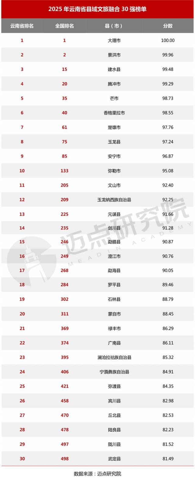 近期,邁點(diǎn)研究院發(fā)布“2025年全國(guó)縣域文旅融合100強(qiáng)榜單”,云南省有10個(gè)縣域入榜,展現(xiàn)出較強(qiáng)的綜合競(jìng)爭(zhēng)力和發(fā)展?jié)摿?。從入圍?shù)量來(lái)看,在全國(guó)各省中處于較為領(lǐng)先的位置;從排名分布而言,部分縣域躋身全國(guó)前列,如大理市、景洪市分別位居2025年全國(guó)縣域文旅融合綜合競(jìng)爭(zhēng)力100強(qiáng)榜單的第1名和第2名,還有一些縣域處于中等位置,發(fā)展空間較大。