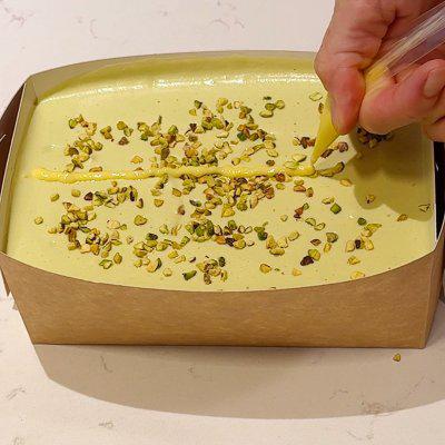 6、把混合好的面糊倒入金枕蛋糕紙盒,撒上開心果碎,在中間擠上黃油