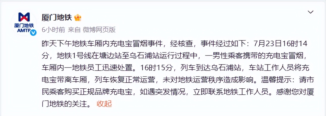 據(jù)介紹,7月23日16時14分,地鐵1號線在塘邊站至烏石浦站運行時,一乘客攜帶的充電寶冒煙,車廂內(nèi)一地鐵員工迅速處置。16時15分,列車到達(dá)烏石浦站,車站工作人員將充電寶帶離車廂,列車恢復(fù)正常運營。