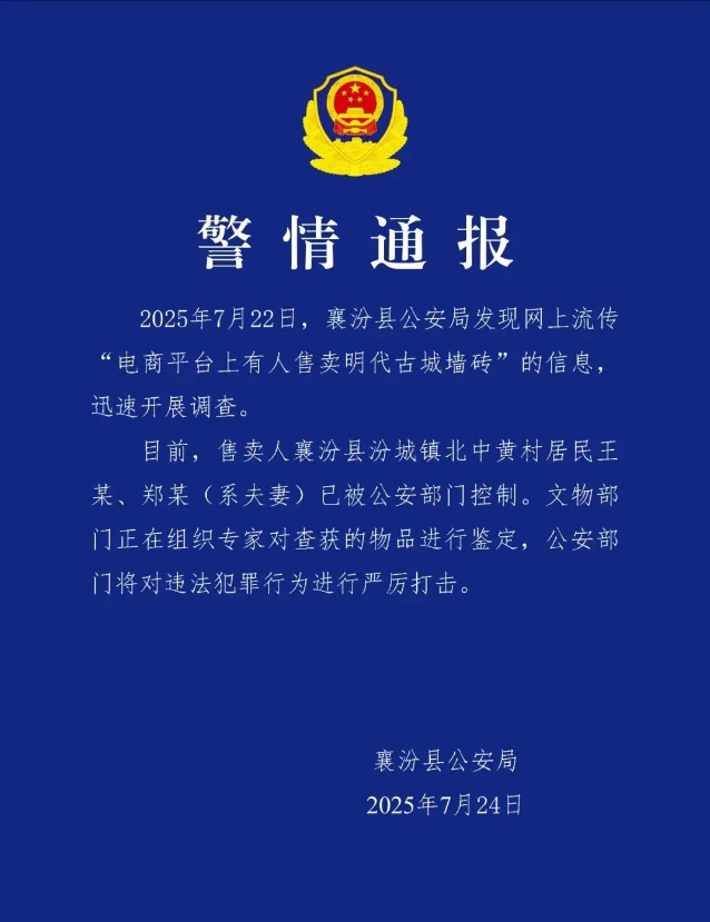 網(wǎng)售明古城墻磚事件:兩人被控制,物品鑒定中