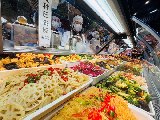 生鮮板塊實現(xiàn)顯著升級?!磅r”度管理成為突出亮點(diǎn),寧夏硒砂瓜、麒麟瓜等擺放整齊,龍泉驛水蜜桃香氣誘人。果切區(qū)執(zhí)行“468鮮度管理”標(biāo)準(zhǔn),4小時后打8折、6小時后打6折、8小時下架。蔬菜品類有南方的“水八仙”,還有多種可溯源的水培、有機(jī)蔬菜。肉禽蛋品類新增亞麻籽豬肉、現(xiàn)切潮汕牛肉等,滿足多樣需求。