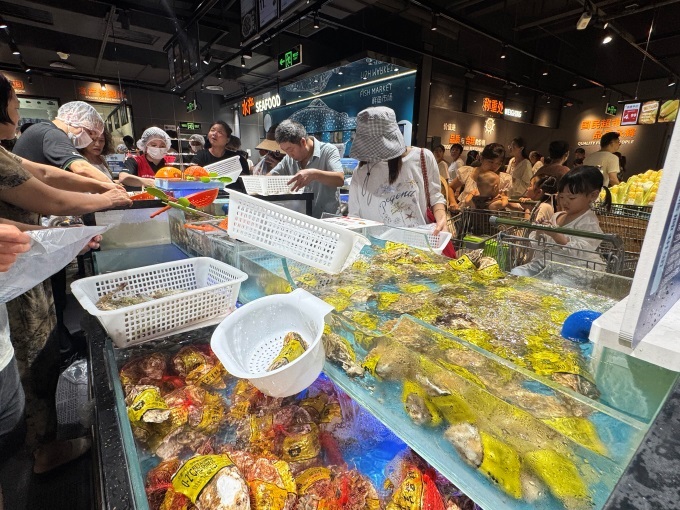 服務(wù)還延伸到了商品處理環(huán)節(jié)。肉禽柜臺的刀工師傅隨時為顧客提供切絲、切片、剝皮、剔骨等個性化服務(wù);海鮮區(qū)的帝王蟹、波士頓龍蝦不僅提供打氧服務(wù),還能現(xiàn)場清洗處理。細節(jié)之處盡顯用心,調(diào)味品貨架旁的放大鏡方便老年人查看配料表;連卷袋邊的濕手器解決了手干撕不開袋子的問題;散裝食品區(qū)標注“1斤≈XX個”,貼心至極。