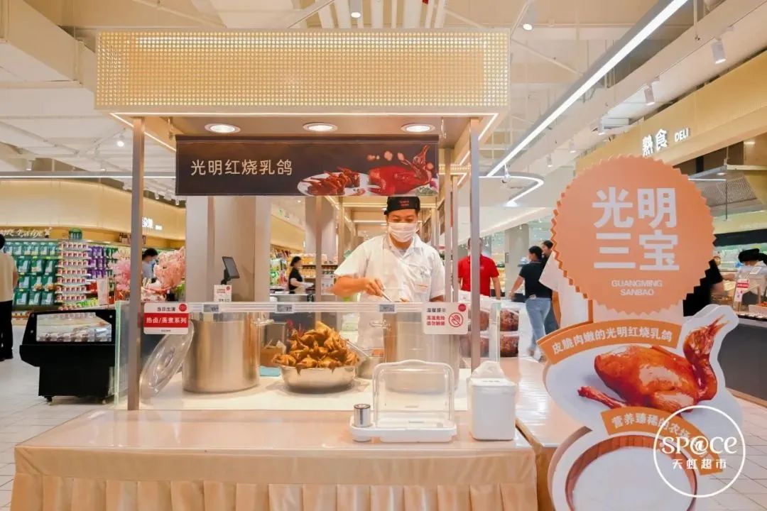 作為深圳光明區(qū)首店,sp@ce3.0公明店與本區(qū)“科技之城”“健康休閑”的定位深度融合,還展現(xiàn)了在地文化,設(shè)立“光明三寶”地標(biāo)美食專區(qū),為顧客提供乳鴿、玉米和牛奶,帶來本土風(fēng)情美食體驗(yàn)。