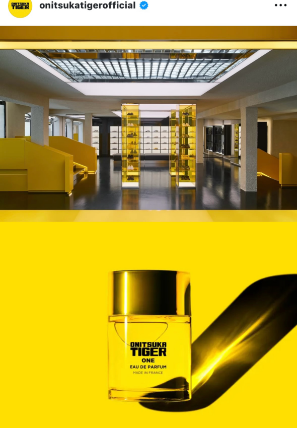 鬼塚虎在法國(guó)的全球旗艦店以“tiger yellow”為概念打造,黃色陳列柜配黑色地面,后續(xù)發(fā)布的香水概念圖也是如此。