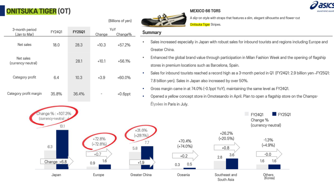 2025年第一季度,亞瑟士銷(xiāo)售額達(dá)208.3億元,增長(zhǎng)34.2%,其中鬼塚虎銷(xiāo)售額28.3億日元,增長(zhǎng)57.2%,是集團(tuán)增幅最大的業(yè)務(wù)。