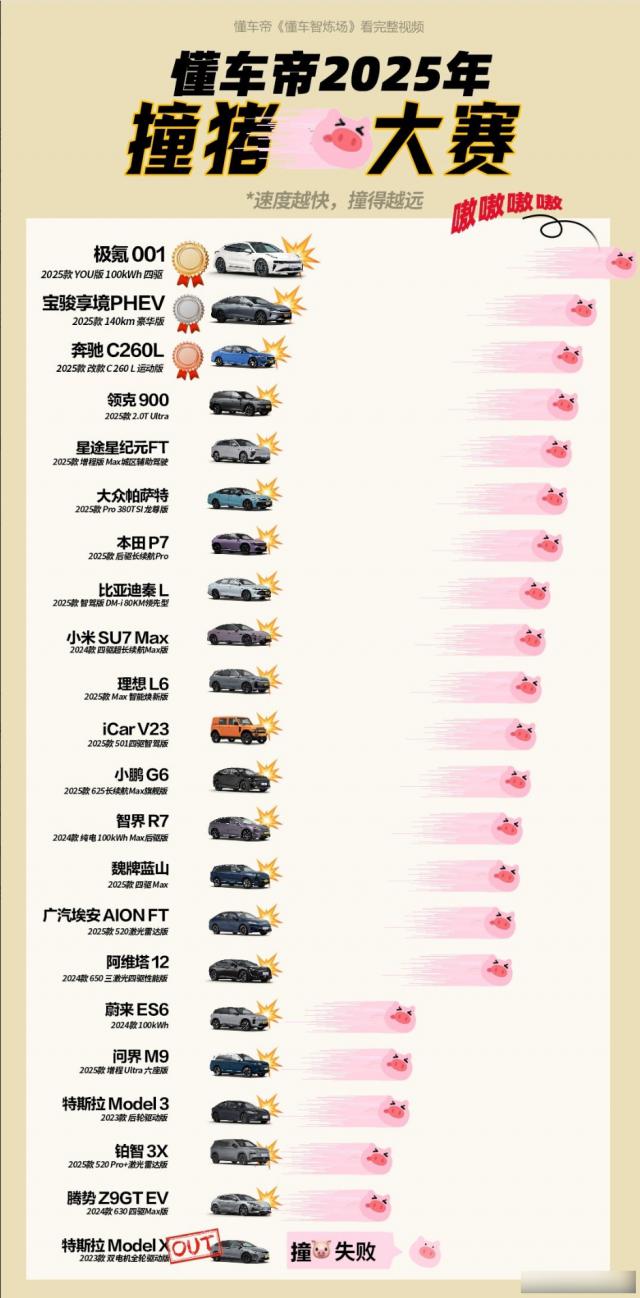 最難的當(dāng)屬“撞豬”項(xiàng)目,高速上一頭野豬突然以10km/h的速度橫穿馬路,這種情況別說智能駕駛,就算是人來開,也很可能會(huì)撞上。有網(wǎng)友還根據(jù)視頻制作了一個(gè)撞豬榜單。