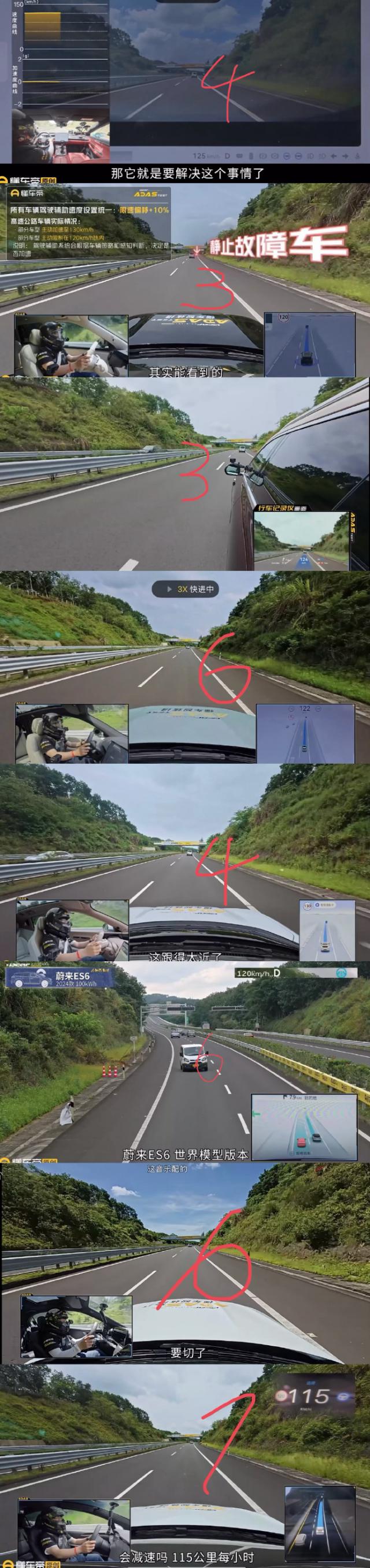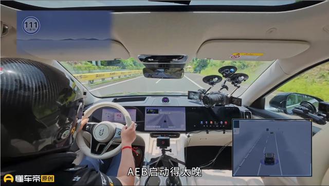 另一個(gè)不統(tǒng)一的是和前車的距離。懂車帝把所有車的跟車距離調(diào)為中間檔位,但不同車型的判定策略不同,實(shí)際跟車距離差異較大。有博主發(fā)現(xiàn),測(cè)試?yán)锴败囃笄谐鰰r(shí),跟車近的只隔3條白線,跟車遠(yuǎn)的隔了7條白線。顯然,跟車遠(yuǎn)的車有更多時(shí)間讓智能駕駛做決策,在這一項(xiàng)有天然優(yōu)勢(shì),所以這個(gè)測(cè)試看似在比AEB,實(shí)則更像是在比誰的跟車距離遠(yuǎn)。因此,駕駛策略保守的車輛,在這個(gè)環(huán)節(jié)可能會(huì)取得較好的結(jié)果。