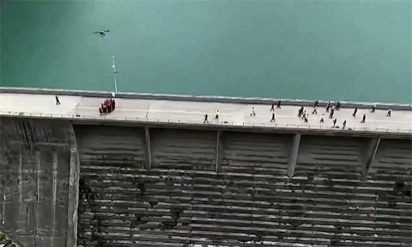 將男子安全轉(zhuǎn)移到大壩下方后,再使用大型無人機連人帶擔(dān)架一起空運到候命的救護(hù)車附近。