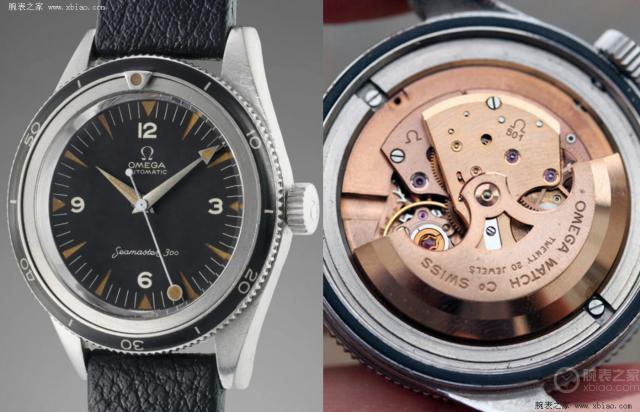 再來看看勞力士的老對手歐米茄。1957 年,歐米茄推出著名的 57“三劍客”:鐵霸、超霸、海馬 300。鐵霸以防磁性能為主,海馬 300 則專注防水。初代歐米茄海馬 300 型號 CK2913,從 1957 年問世到 1961 年停產,有 8 個版本,不同版本在指針、外圈等細節(jié)上有差異。但都采用 38.5 毫米精鋼表殼,搭載歐米茄 501 型自動上鏈機芯。需注意,盡管產品名稱有“300”字樣,實際防水性能為 200 米。