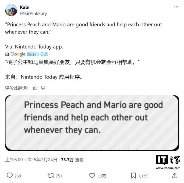 任天堂在介紹碧姬公主時提到了這一描述,不過隨后該內容被清理,但仍有不少網友截圖留存。IT之家翻譯相關描述為:“馬力歐和碧姬公主只是好朋友,而且無論何時雙方都彼此幫助”。