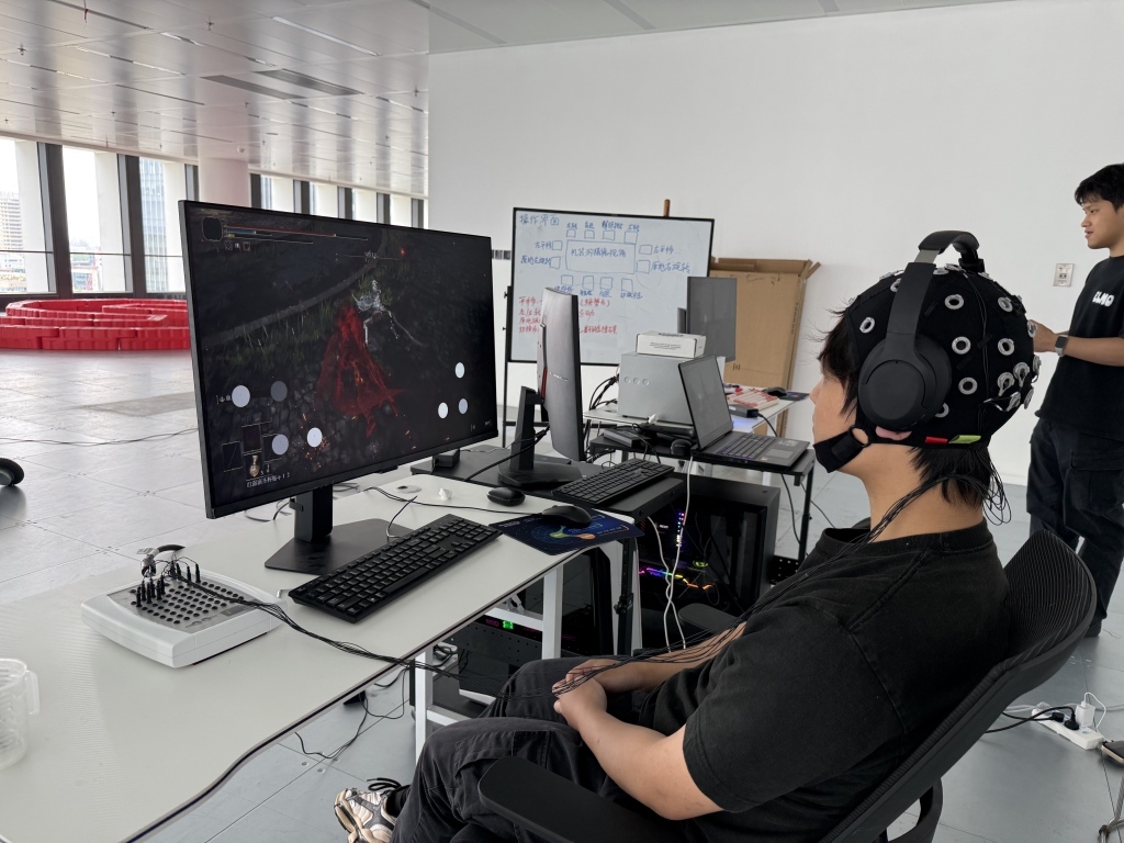 2025年7月18日,上海張江模力社區(qū),工作人員佩戴“腦電帽”,全程無(wú)需手部操作,用意念操控游戲角色。澎湃新聞?dòng)浾?陳斯斯 攝