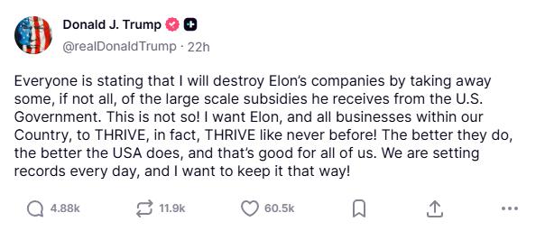 “我希望埃隆,以及我們國家所有企業(yè),都能蓬勃發(fā)展,事實上,是前所未有的繁榮!”他周四在真相社交上寫道。特朗普還談到不會取消“馬斯克從美國政府獲得的大規(guī)模補貼”。該帖被視為特朗普試圖與其曾經(jīng)的親密盟友馬斯克休戰(zhàn)的信號。