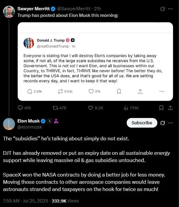 然而,馬斯克對此并不買賬。他逐條反駁了特朗普的帖子。