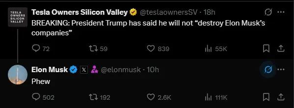 馬斯克還諷刺地回應(yīng)了特朗普關(guān)于不會“摧毀埃隆·馬斯克的公司”的承諾。在回應(yīng)一條關(guān)于此新聞的推文時,他寫道:“(我)松了口氣(Phew)?!?/p>