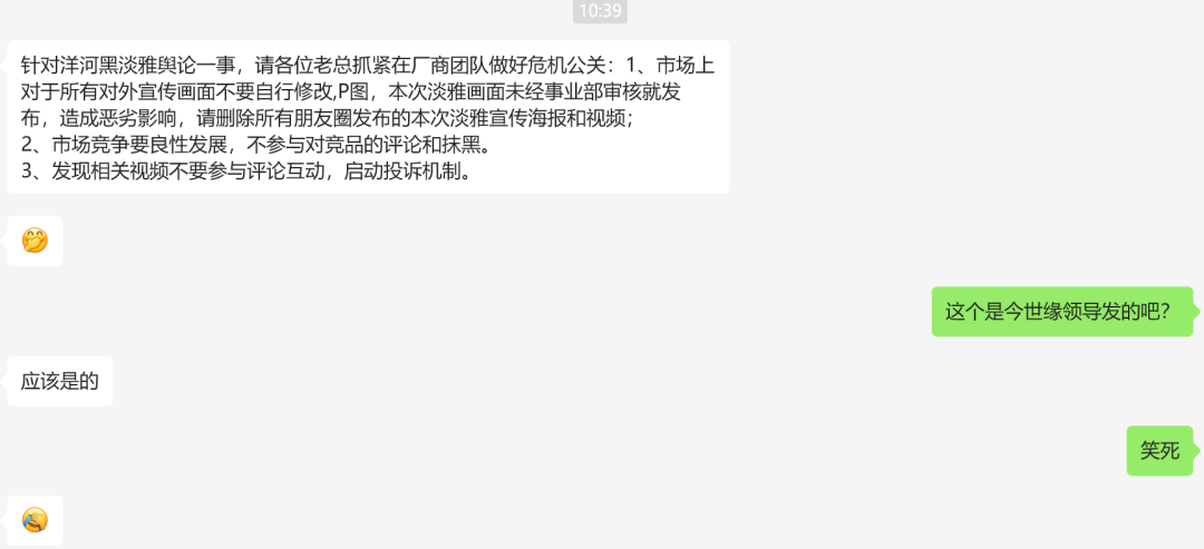 “針對(duì)洋河黑淡雅輿論一事,請(qǐng)各位老總抓緊在廠商團(tuán)隊(duì)做好危機(jī)公關(guān):
