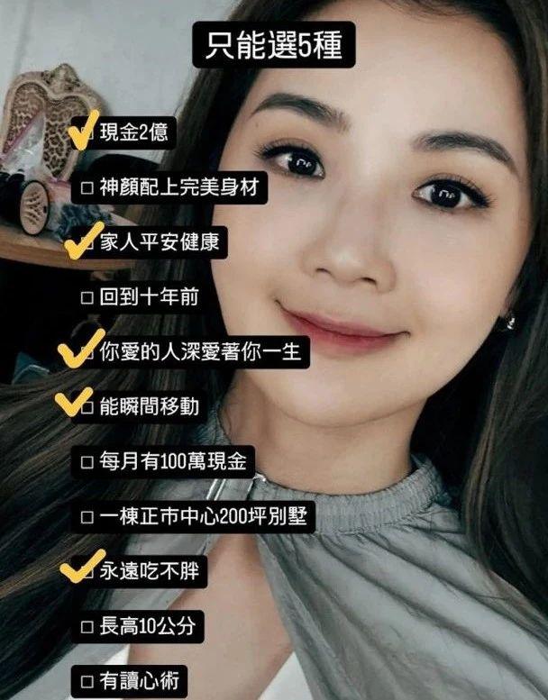 她日前在社交網(wǎng)發(fā)文,選了5種愿望,包括「現(xiàn)金2億」、「家人平安健康」、「能瞬間移動(dòng)」、「永遠(yuǎn)吃不胖」,令人注意的是阿Sa想要「你愛(ài)的人深?lèi)?ài)著你一生」,看來(lái)她對(duì)感情仍非常樂(lè)觀!