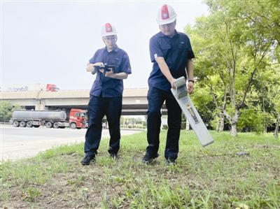 巡查中,陳光緊盯電腦數(shù)值,因管道在地下,肉眼看不見,不能遺漏任何異常。巡查路不平坦,降雨后綠化帶和土路泥濘,他和同伴需手持探查設(shè)備檢測。大暑時節(jié)悶熱,他們手持約1米高的探查儀在草地作業(yè),汗水濕透衣服。遇到燃氣井,同伴打開井蓋,他們用儀器反復(fù)探測井口等位置。