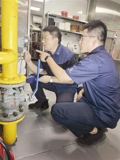 臨近中午,張骉和工作人員來到一家使用管道天然氣的餐館。他們查看燃氣管道和壓力表數(shù)據(jù),檢查管道周邊是否有雜物,確認灶眼統(tǒng)一使用天然氣。張骉解釋,不同燃料燃點不同,避免混用才能保證安全。巡查結(jié)束,他們還會叮囑廚師長用氣注意事項。