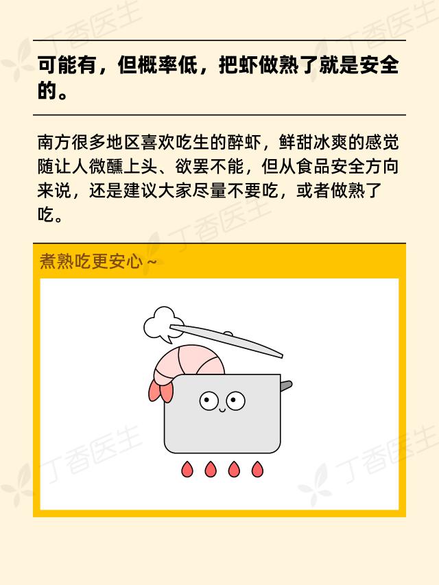 蝦中可能存在寄生蟲,不過做熟后食用是安全的。喜歡吃醉蝦的話,推薦選擇熟醉蝦,既能保證美味又能確保安全。