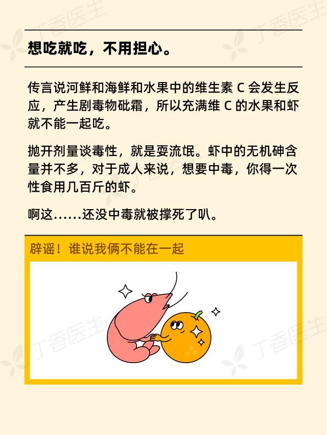 蝦和水果可以一起吃,不會(huì)中毒(傳言中的有毒反應(yīng)極其微量,吃到撐可能都不會(huì)出現(xiàn)中毒情況)。